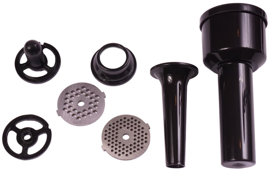 Назначение насадок и аксессуаров настолько очевидно, что не будем впустую тратить время читателя. Отметим только, что комплект аксессуаров к мясорубке идентичен полному набору насадок этого типа приборов в версии моно: три решетки, насадки для кеббе, колбасок и выдавливания теста фигурными полосками.