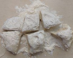 Поэтому мы взяли 150 граммов муки и смешали ее со ста миллилитрами холодной воды. Тесто замешалось быстро и равномерно, было липким и осталось на крюке.