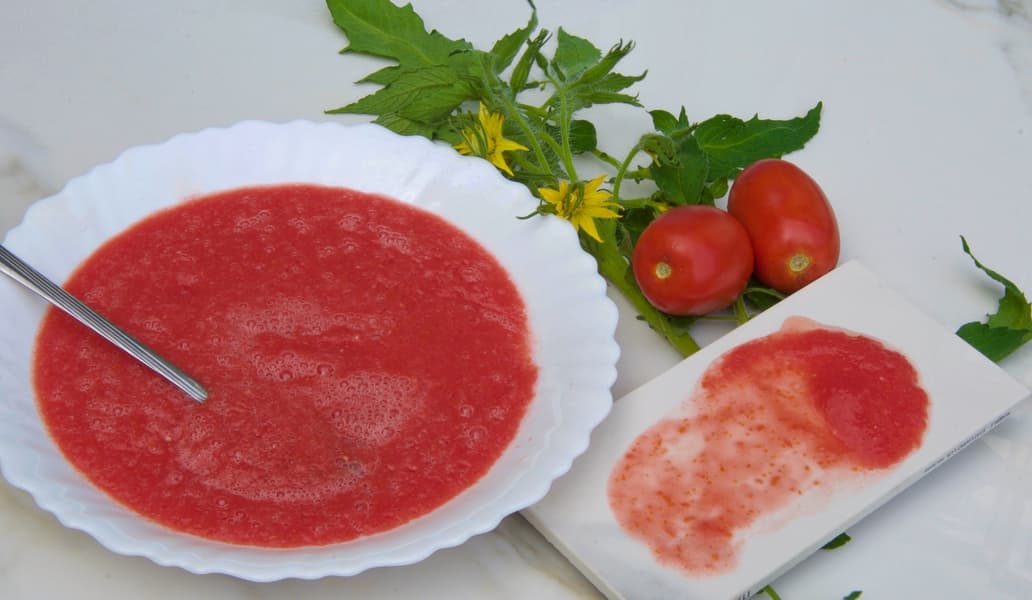 Весь объем томатов без дополнительной нарезки был засыпан в чашу. К нашему удивлению, никаких сложностей с подхватыванием ножами половинок не возникло, и через две минуты работы блендера на средних оборотах мы получили взбитую гомогенную массу с едва различимыми фрагментами кожуры и семян.