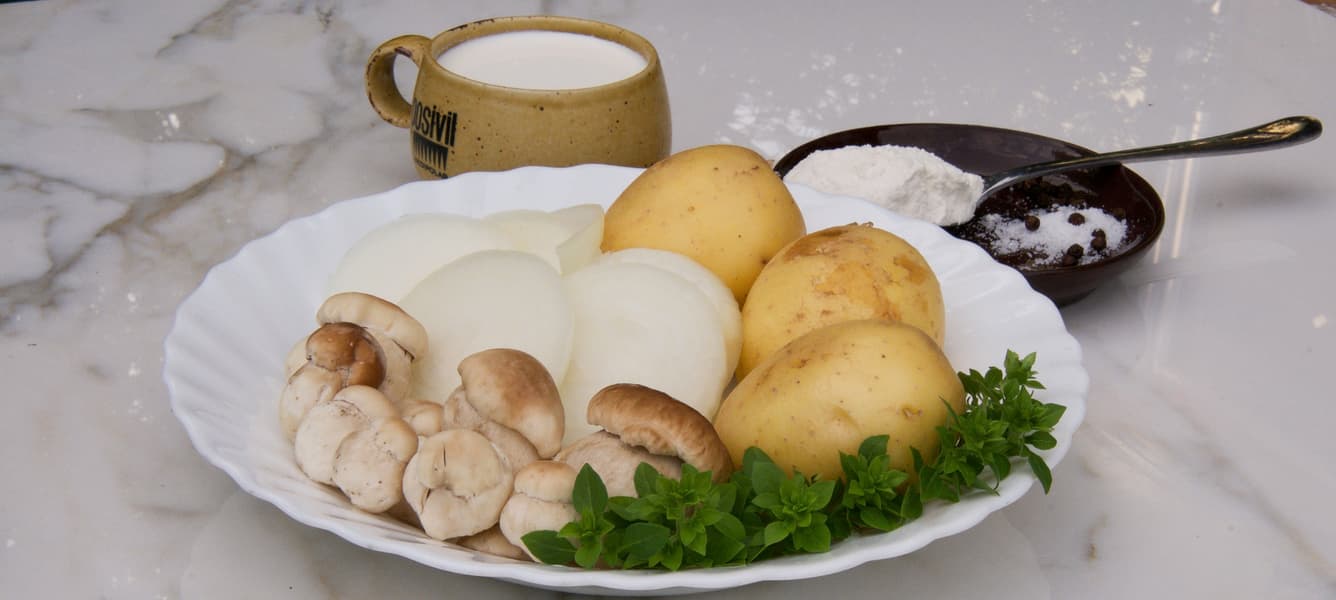 Вдохновившись результатами всех предыдущих экспериментов, мы решили дать блендеру задачу посложнее. Мы взяли грибы, лук, картофель, сливки, молоко, муку, соль, перец и базилик.