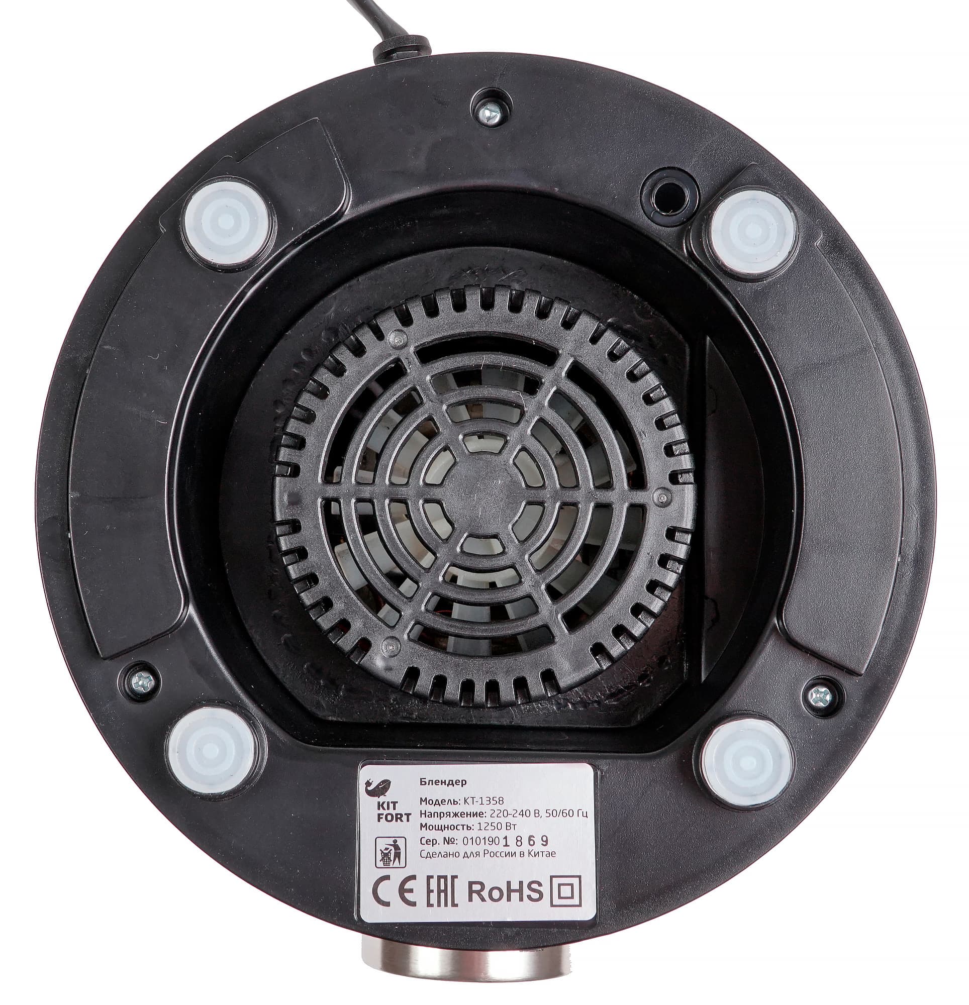 При первом рассмотрении KT-1358 не вызывает бурных эмоций. Он небольшой, не тяжелый, без броских элементов дизайна. Такой прибор впишется в практически любой интерьер, но взгляда не притянет. Моторный блок изготовлен из пластика и закрыт металлической накладкой. На нем мы видим круглую ручку — единственный элемент управления. Кроме нее на корпусе есть выштампованный логотип Kitfort и четыре напечатанных значка положения ручки. Снизу предусмотрен отсек для хранения шнура, но он не очень удобен.