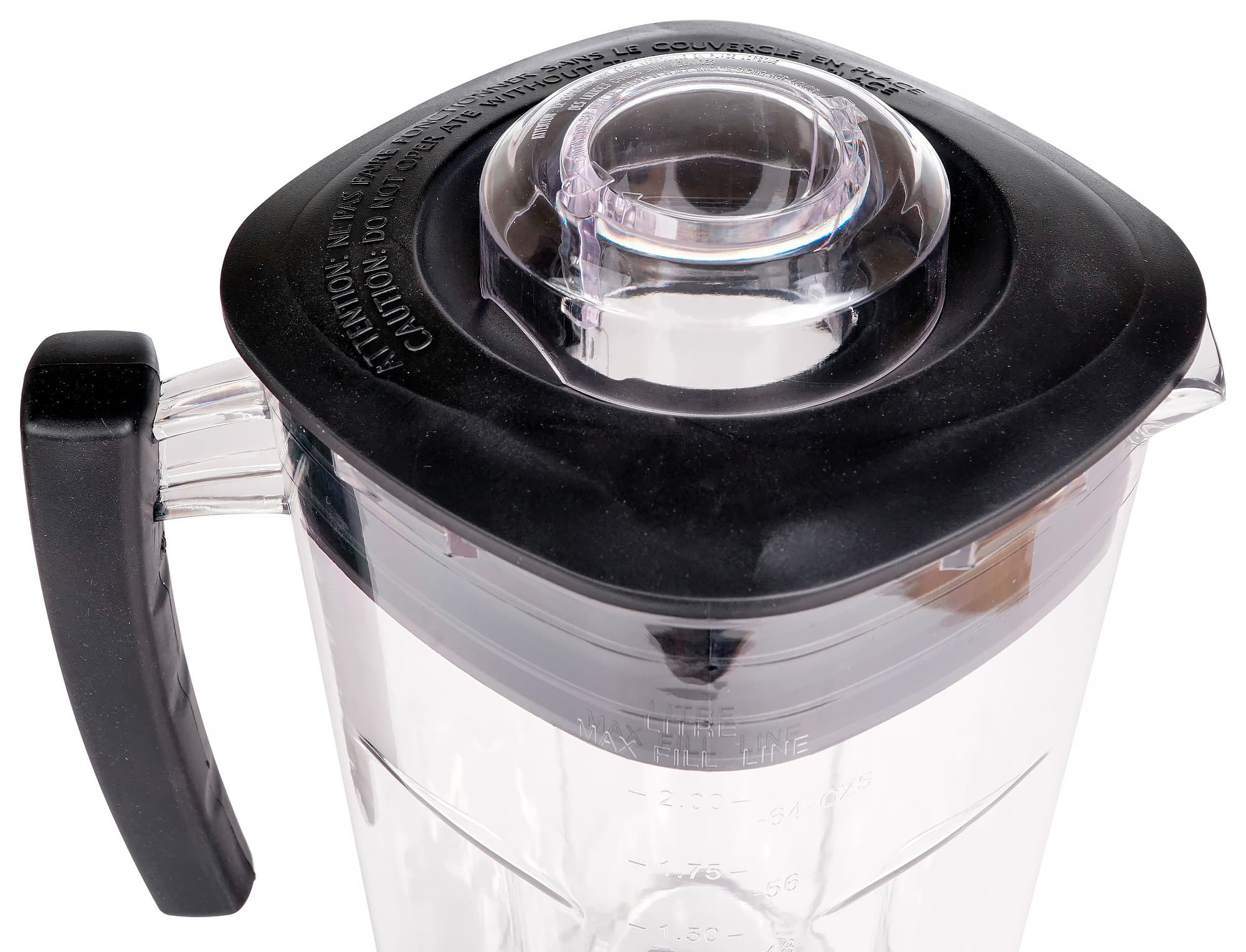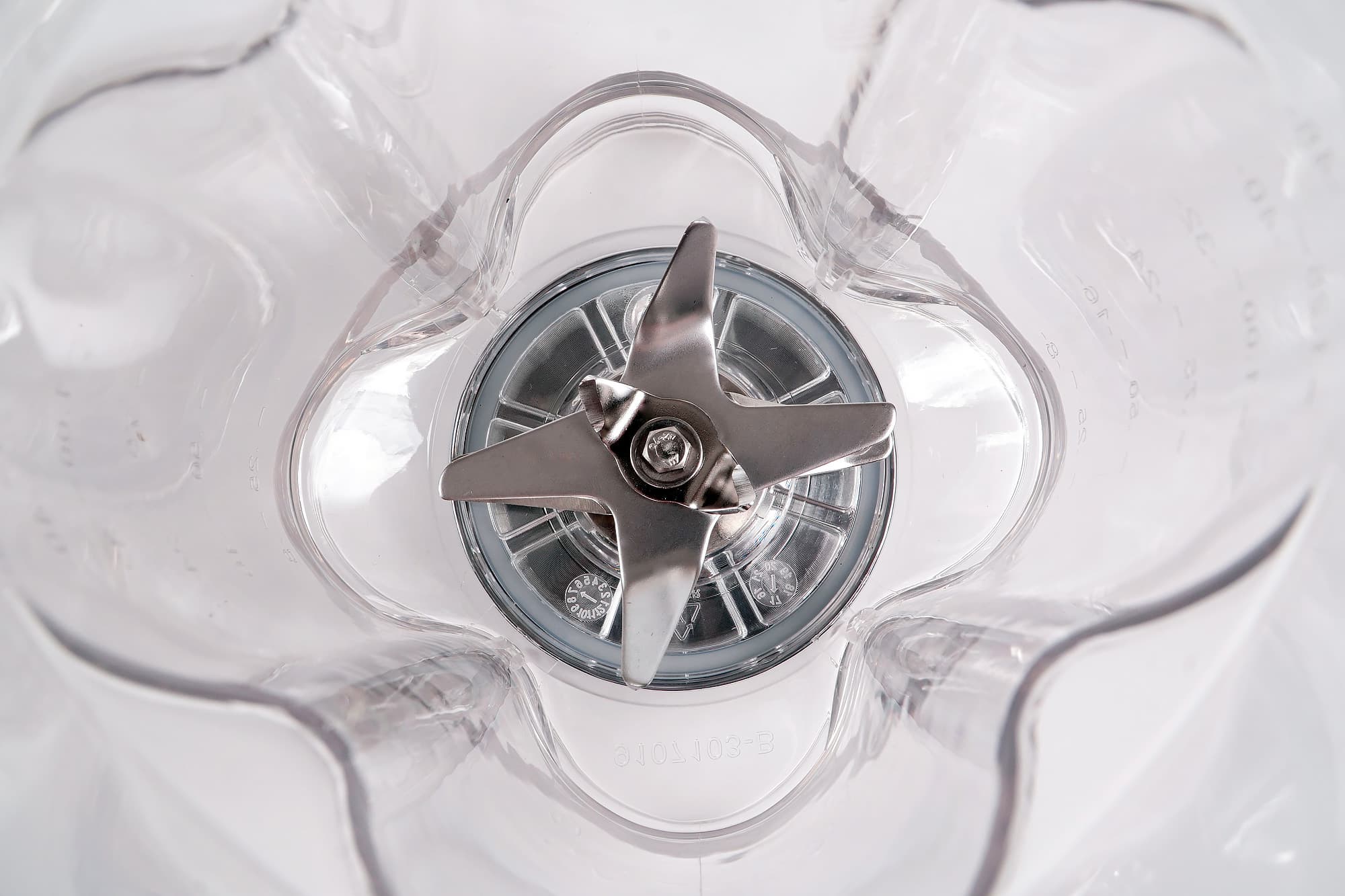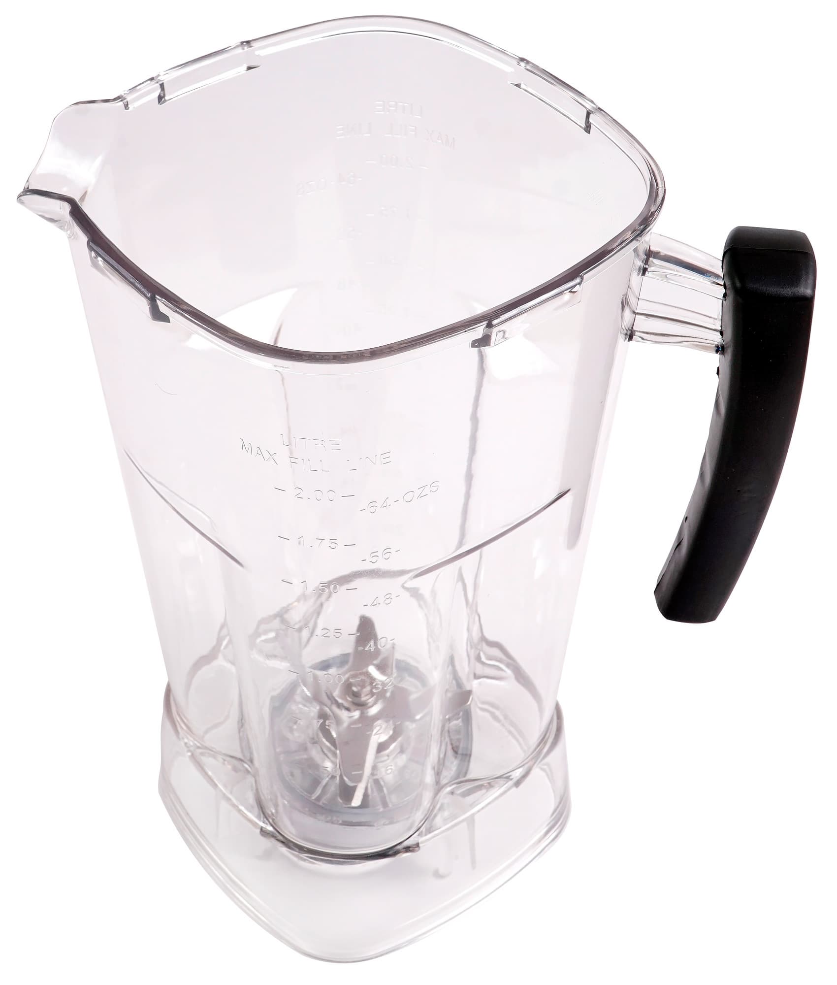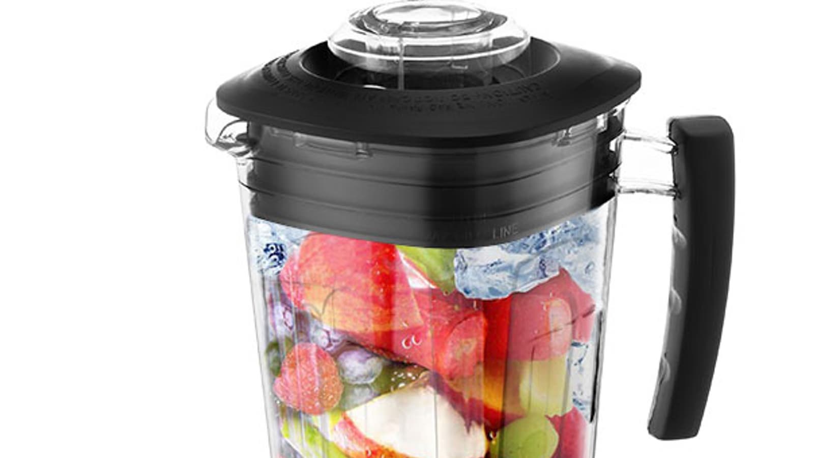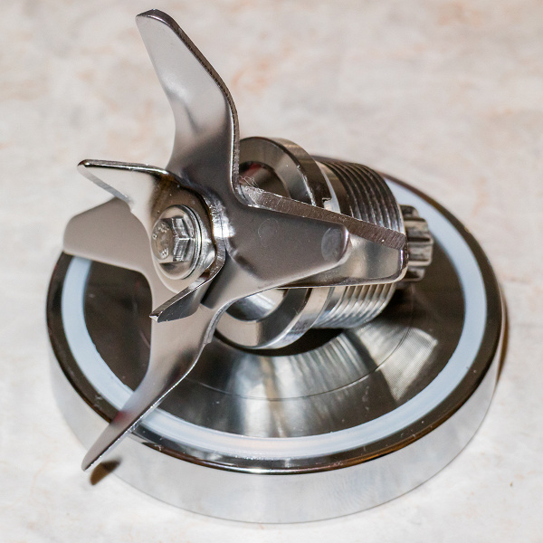 Чаша блендера представляет собой пластиковую емкость рабочим объемом в два литра. На стенках нанесены отметки как в метрической, так и в английской системе мер с шагом в 250 мл или 8 унций. Привлекает внимание необычная форма чаши — в форме клевера. Производитель заявляет, что такая форма обеспечивает эффект циклона, что, в конечном итоге, приводит к идеальным результатам смешивания. Наша практика показывает, что в чашах такой формы смешивание даже густых ингредиентов действительно осуществляется эффективно. Емкость оснащена носиком для слива готового напитка и ручкой с прорезиненным покрытием. Ручка надежно и без скольжения размещается в руках.