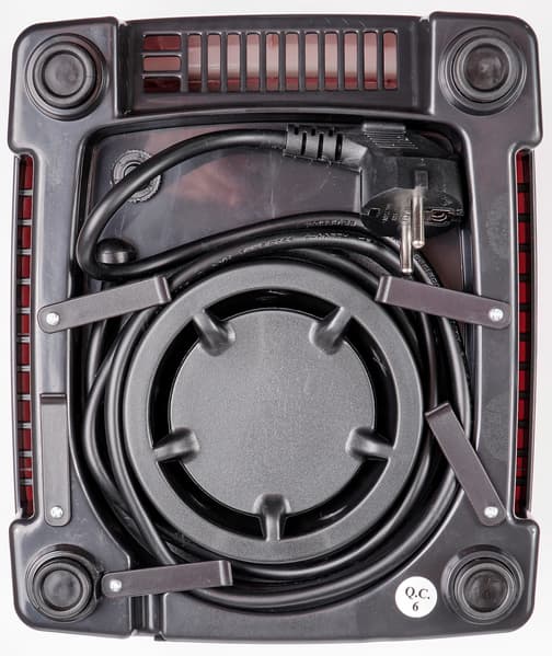 Со стороны дна можно увидеть вентиляционные отверстия, высокие ножки с мощными, сантиметровыми в высоту резиновыми накладками и отсек для скрутки шнура. Интереснее всего наличие кнопки Reset — ею придется воспользоваться, если мотор перегреется, и сработает защита от перегрева.