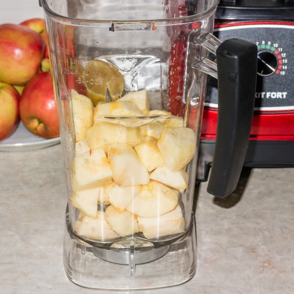 Начали тест мы скромно: заложили в чашу один банан и три крупно нарезанных яблока, очищенных от кожуры и семечек. Добавили сок половины лимона.