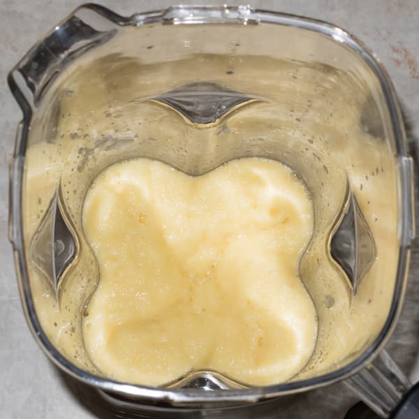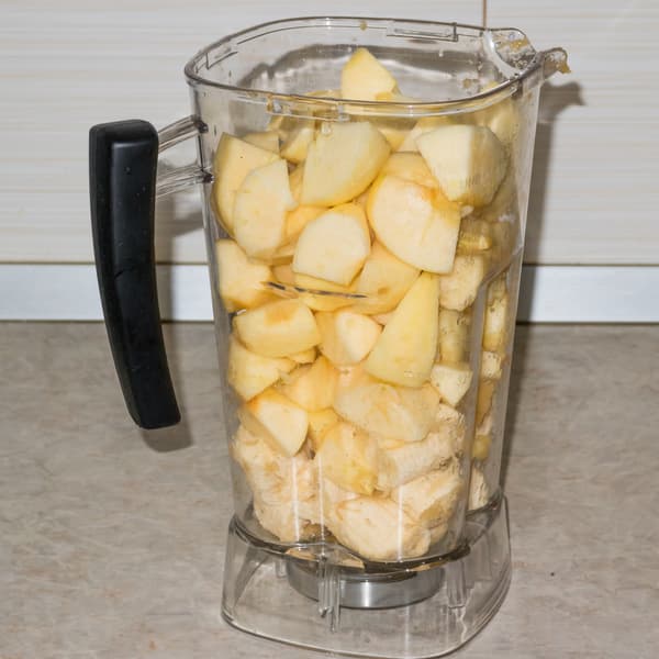Затем мы загрузили блендер полностью: в чашу поместилось почти 1,2 кг фруктов. Бананы мы просто поломали на несколько частей, яблоки нарезали довольно крупно. Отдельно подчеркнем, что измельчали практически без добавления жидкости — на указанную массу мы выжали вручную сок одного небольшого лимона.