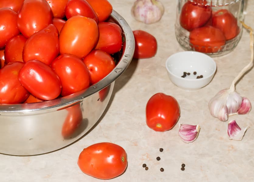 Чаша большая, блендер мощный, поэтому мы решили не размениваться на мелочевку и поместили в кувшин один килограмм подготовленных помидоров. Для теста использовали томаты сорта Сливка, отличающиеся жесткой шкуркой и наличием крупных косточек. Задача перед блендером будет стоять трудная — сырье действительно сложное для такого типа переработки. Нарезали помидоры крупно: мелкие просто пополам, крупные — на четыре части.