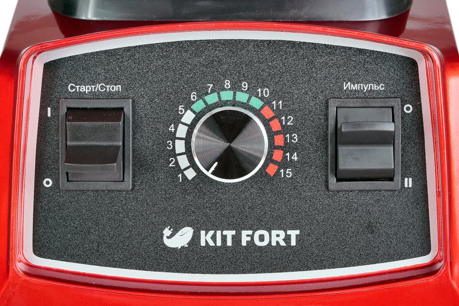 Панель управления, расположенная на фронтальной стороне моторного блока, представлена двумя переключателями и круглым регулятором скорости. Назначение переключателей и регулятора интуитивно понятны. Левый переключатель запускает работу, правый включает режим импульса — мгновенно запускает вращение ножей на максимальной скорости. Регулятор постепенно увеличивает скорость от первой до 15. Окружность разделена на три сектора, отмеченные цветом: белый — 1—5 (минимальная скорость), зеленый — 6—10 (средняя) и красный отрезок — 11—15 (максимальная).