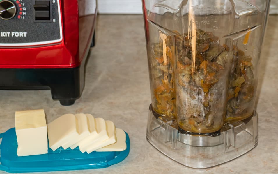 Обжарили на растительном масле лук и морковь, затем добавили куриную печень. Некоторое время тушили, затем остудили. Выложили в чашу блендера, добавили размягченного сливочного масла, взяли в руки толкатель и приступили к получению паштета.