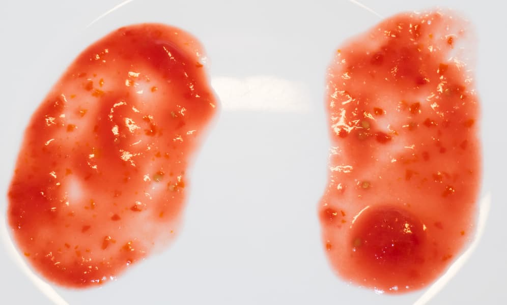 Через минуту блендирования остановили работу и оценили результат. В помидорной массе встречаются как отчетливо видимые кусочки шкурки, так и неизмельченные косточки. Продолжили измельчение в течение еще одной минуты. Результат практически тот же, разве что неперемолотых косточек стало немного меньше. Результаты представлены на снимке: слева — через минуту блендирования, справа — спустя две минуты.