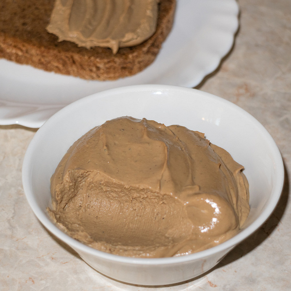 Консистенция паштета — выше всяких похвал: гладкая, абсолютно гомогенизированная. Заметим, что никакой жидкости при измельчении добавлено не было — только сливочное масло и немного выделившегося сока от тушения овощей и печени.