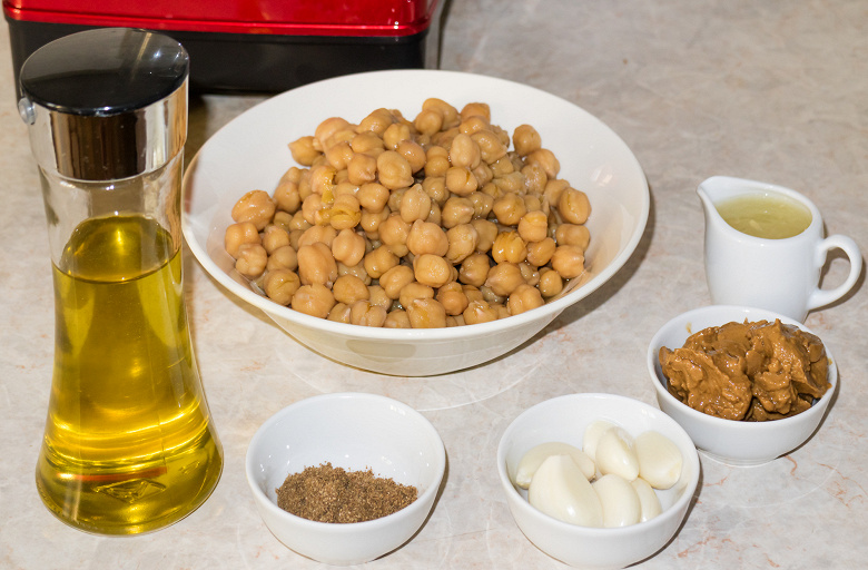 Затем выложили нут в чашу блендера, добавили немного отвара, тхину, оливковое масло, чеснок, лимонный сок, соль и молотую зиру. Измельчали всего 6 минут 14 секунд. Скорость была увеличена до пятой. За время работы блендер потребил 0,062 кВт·ч.