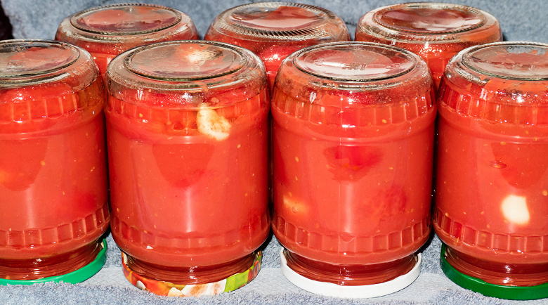 При взгляде на чашу настойчиво приходят мысли или о варке супа-пюре в стратегических количествах или о заготовках на зиму. Супа нам не хотелось, а вот мысль о томатах в собственном соку согревала душу. Поэтому следующей закладкой мы измельчали уже два килограмма томатов. Блендер прекрасно справился с задачей. Добавили к трем литрам томатной массы 6 ложек соли и 6 ложек сахара, проварили ее в течение 15-20 минут, пока не исчезла пена. Затем залили ею подготовленные очищенные и предварительно залитые кипятком помидоры. Закрутили банки и укутали их в толстое полотенце.