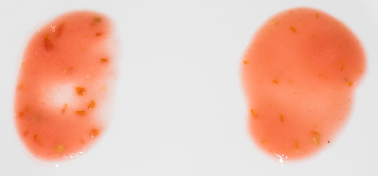 Кусочки помидоров буквально за несколько секунд превратились в жидкую массу. Однако по завершении работы в течение 20 секунд в готовом пюре встречались как неизмельченные косточки, так и отдельные фрагменты шкурки. Мы включили блендер еще на 30 секунд, и результат нас искренне порадовал: помидоры превратились в однородную пышную массу, косточки и шкурка оказались измельчены. Мощность во время данного теста была равномерна и составила 230-250 Вт.