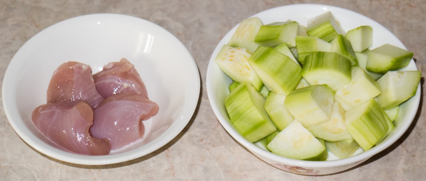 Отварили 100 г нарезанной грудки, в конце добавили 300 г кабачка. Сняли с огня и дали продуктам немного остыть. Измельчали еще теплые продукты.