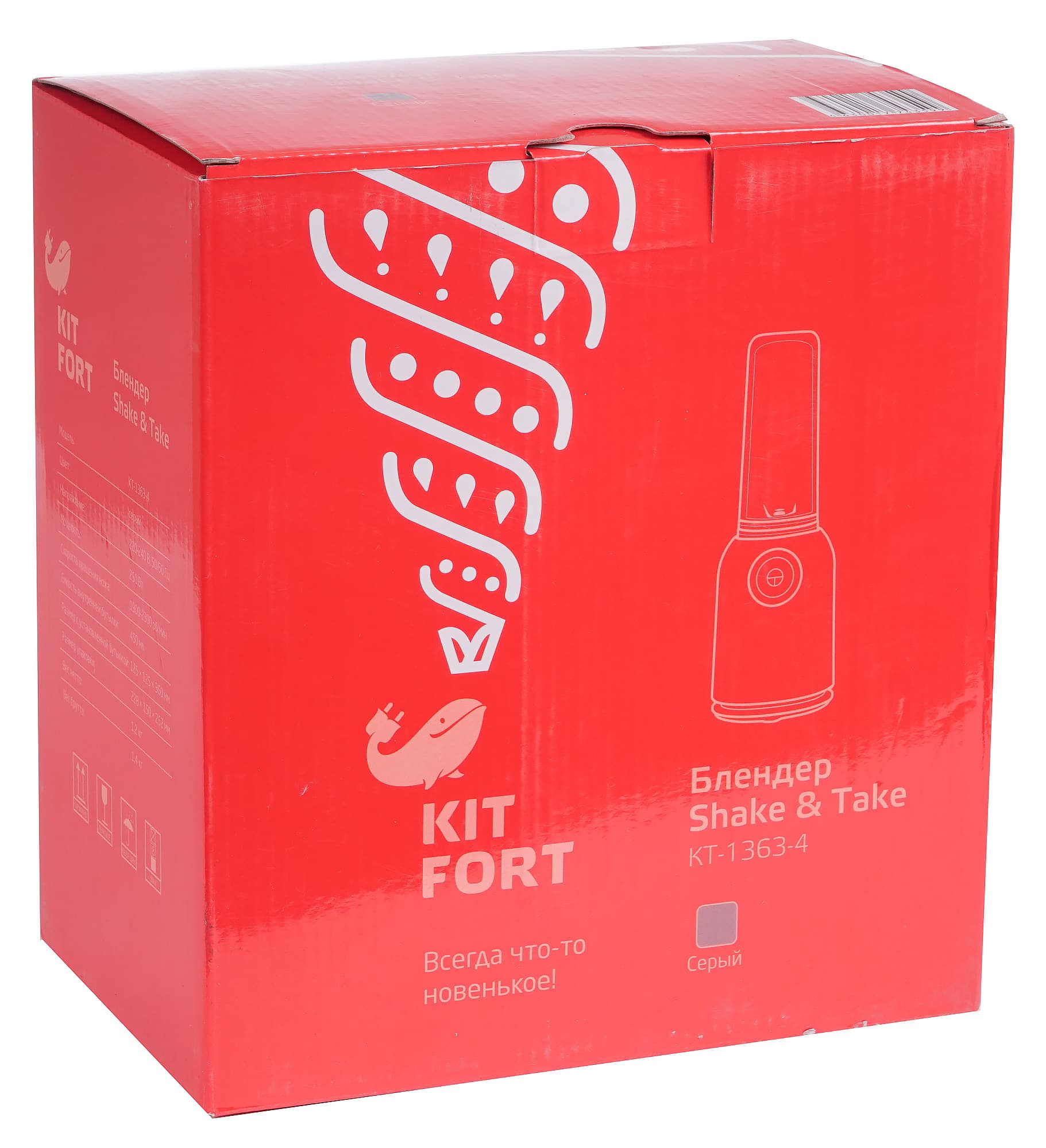 Блендер уложен в коробку небольших размеров. На ярко-красном фоне упаковки можно рассмотреть стандартные элементы оформления в стиле Kitfort: кит в качестве логотипа, фраза «Всегда что-то новенькое» в качестве слогана, схематическое изображение устройства, его наименование и номер модели. Информация, размещенная на боковых сторонах, знакомит пользователя с преимуществами и особенностями прибора, а также его техническими характеристиками. Ручкой для переноски упаковка не оснащена.