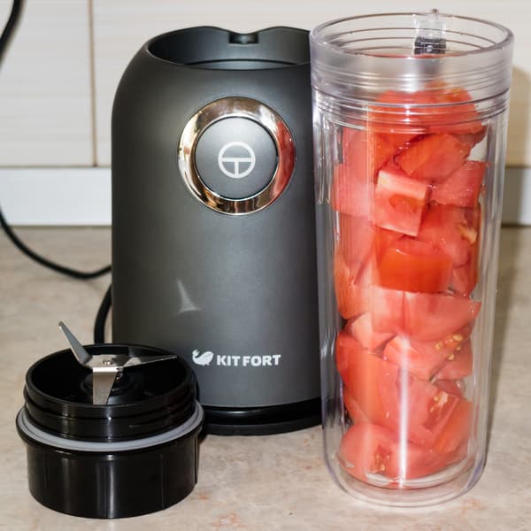 Напомним, что данный тест является обязательным при тестировании блендеров. В стакан персонального блендера Kitfort KT-1363 поместилось 380 г нарезанного томата.