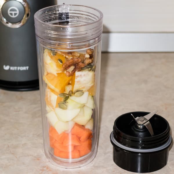 Персональный блендер Kitfort KT-1363 выпущен под лозунгом Shake&Take. Действительно, в качестве емкости для смешивания в этом приборе небольшого размера используется пластиковый стакан. Аксессуар оснащен специальной крышкой, так что приготовленный напиток можно взять с собой в дорогу, на тренировку или на работу. Двойной стакан позволяет дольше сохранять температуру приготовленного напитка. Бутылка помещается в подстаканник автомобиля или любую подобную специальную подставку.