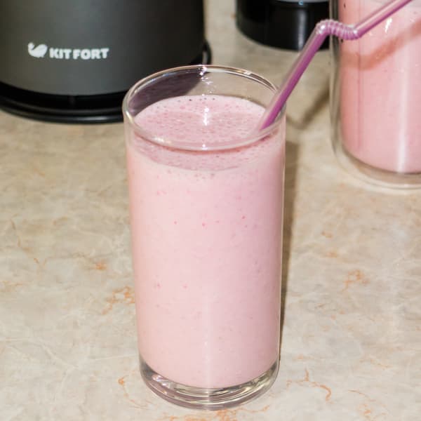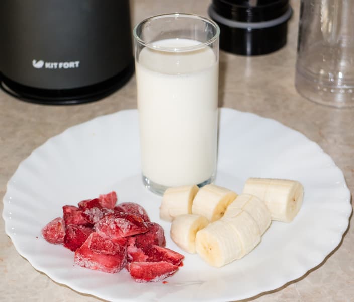 Приготовив этот коктейль, мы узнаем, насколько успешно Kitfort KT-1363 может измельчать замороженные продукты. Для приготовления напитка мы взяли 50 г замороженной клубники, один банан и стакан молока.