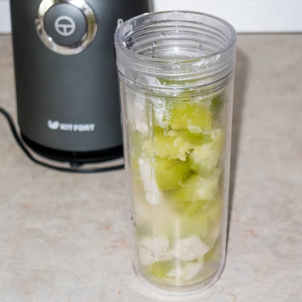 В качестве предназначения блендера Kitfort KT-1363 производитель упоминает и приготовление детского питания. Блендер небольшой, достаточно мощный для измельчения мягких продуктов, поэтому мы решили проверить, как он справится с гомогенизацией овощного пюре и мясного ингредиента. В качестве овоща использовали кабачок, в качестве мясного составляющего — грудку индейки.