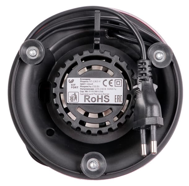 Со стороны дна прибор оснащен тремя ножками с резиновыми присосками, обеспечивающими хорошее сцепление с поверхностью стола. По центру можно видеть вентиляционные отверстия и наклейку с краткой технической информацией о блендере. Между корпусом и основанием, на котором закреплены присоски, имеется некоторое расстояние — это пространство используется как отсек для хранения шнура. Сюда же можно замотать излишки шнура при работе, если розетка находится совсем рядом. Длина шнура нам представляется достаточной и не чрезмерной для использования в обычных бытовых условиях.