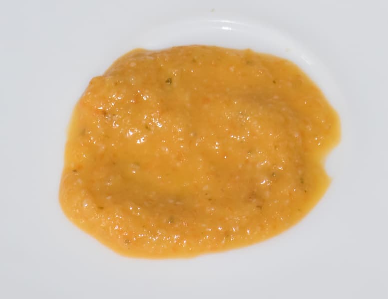 Сначала работали импульсами по несколько секунд, затем примерно 10-15 секунд блендер работал без остановки. В результате получили абсолютно гомогенную структуру — и овощи, и мясо превращены в однородную массу. По консистенции похоже на густой суп-пюре. Если необходима более плотная структура, то можно добавить меньшее количество бульона, образовавшегося при варке индейки и кабачка.