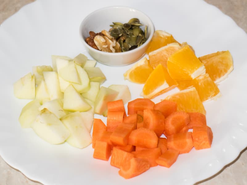 Морковь — 1 шт., яблоко — ½ шт., апельсин — ½ шт., яблочный сок или минеральная вода без газа — 50 мл, тыквенные семечки — горсть, грецкие орехи — горсть, оливковое масло — 1 ч. л.