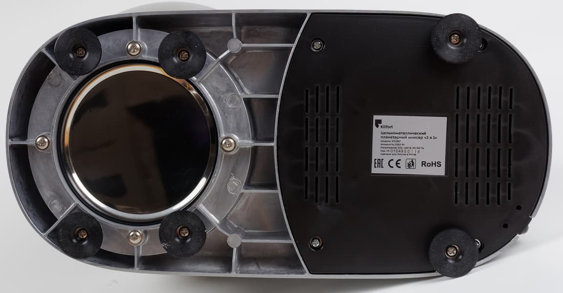Начнем осмотр снизу. На нижней плоскости прибора расположены шесть ножек с присосками, которые не дадут миксеру скользить по рабочей поверхности. Четыре ножки при этом сосредоточены в зоне крепления чаши, а две оставшиеся — ближе к задней части прибора. На дне моторного блока есть также шильда со сведениями о производителе и о технических характеристиках прибора.
