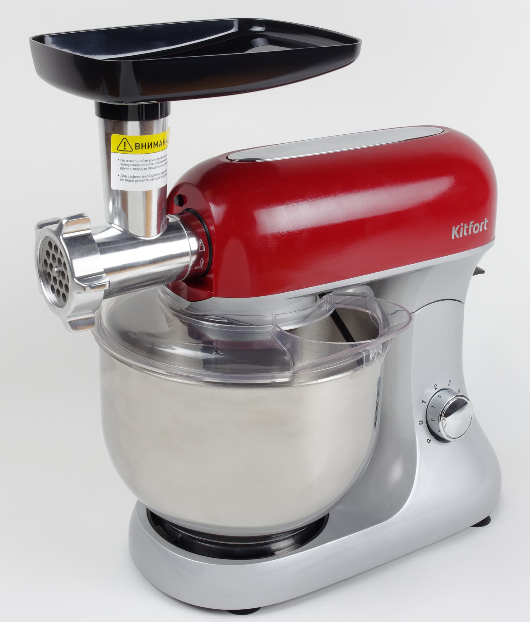 При работе как в качестве планетарного миксера, так и в качестве мясорубки Kitfort KT-1367 имеет один существенный недостаток: гладкая рукоятка управления не позволяет переключать скорости и выключать прибор жирными или мокрыми руками, проскальзывает. В случае с мясорубкой это особо значимо. Поэтому рядом надо постоянно держать бумажное полотенце или салфетки.