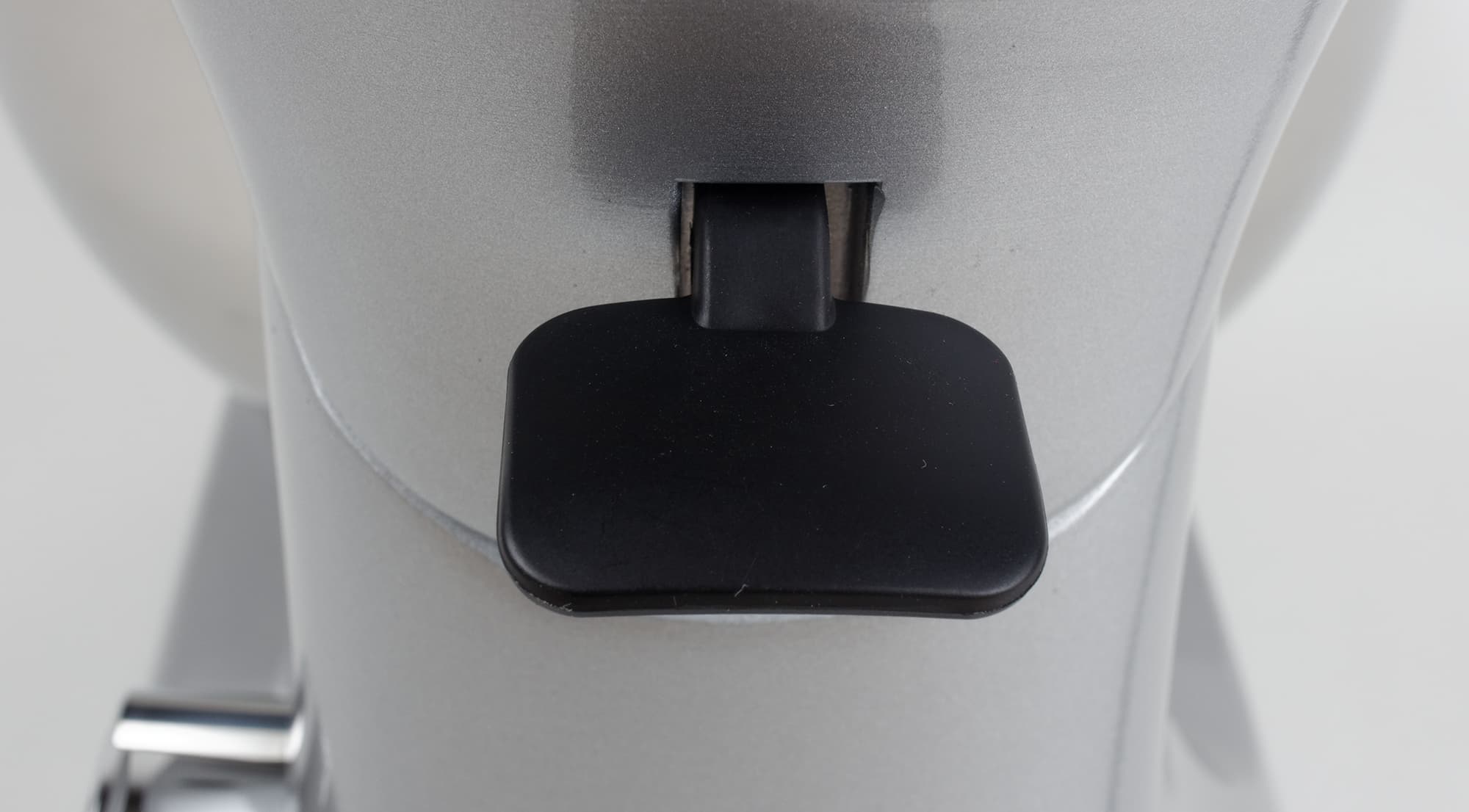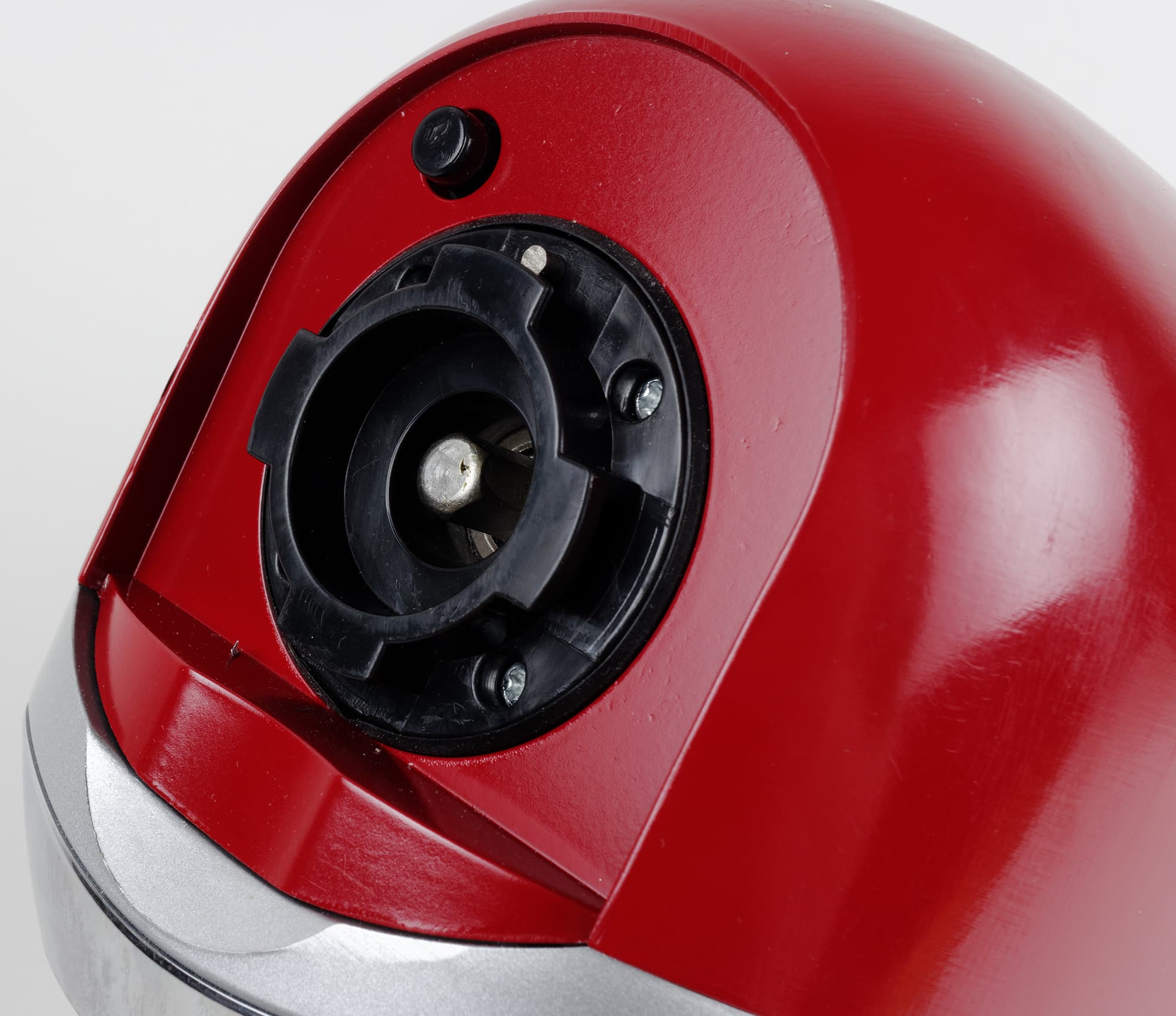 На той части подвижного блока, которая обращена к пользователю, есть блестящая накладка, которая закрывает гнездо для крепления мясорубки. Ее можно снять, поддев снизу и потянув на себя. Ставить ее на место надо обратным движением: совместить верхние кромки заслонки и выреза и нажать на нижнюю часть заслонки до щелчка.