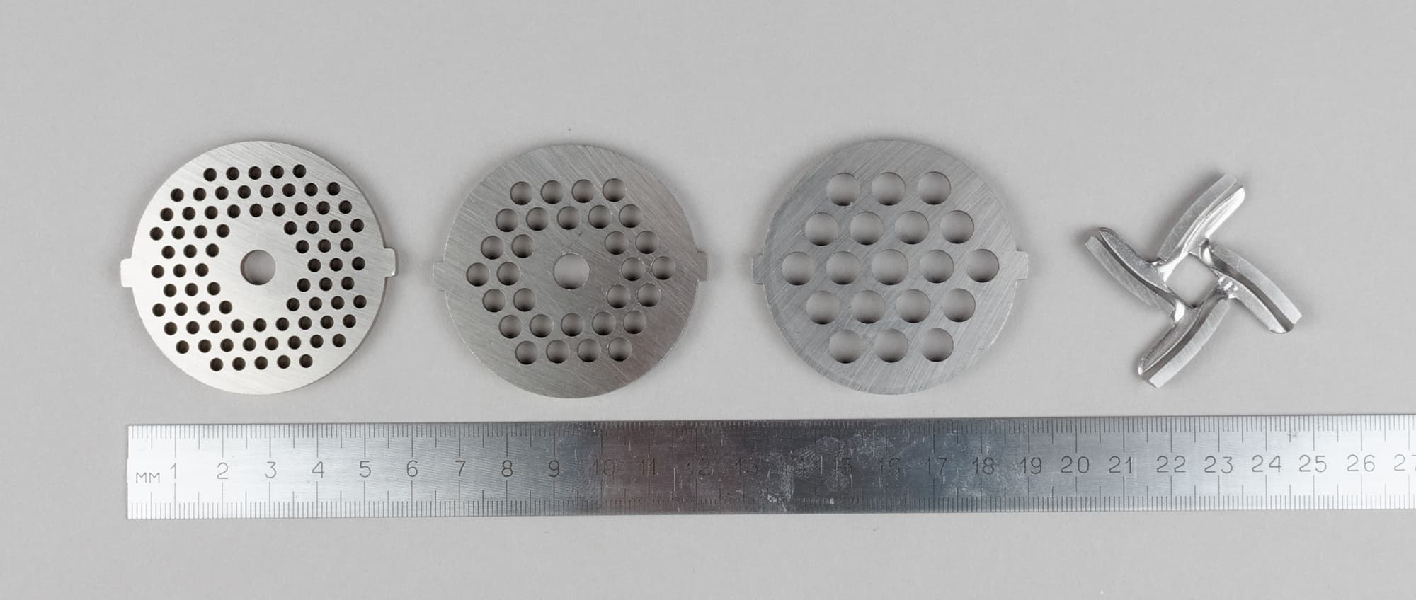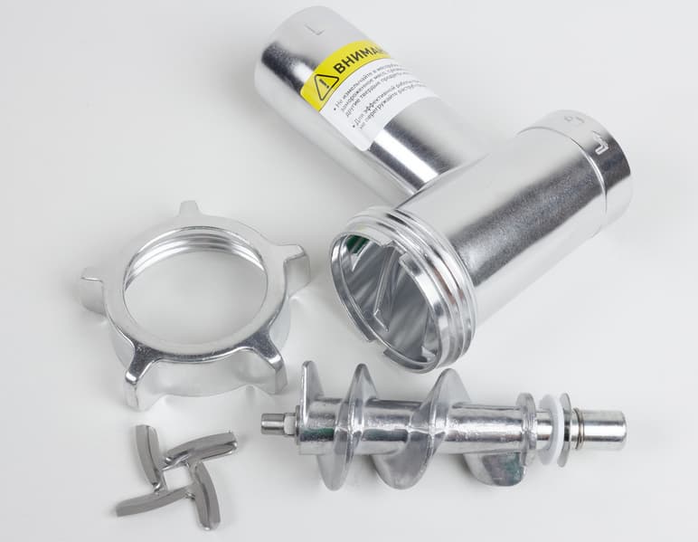 Мясорубка поставляется с тремя стальными решетками для измельчения фарша — с отверстиями приблизительным диаметром 2,5, 5 и 7 мм. Качество изготовления стальных элементов весьма неплохое, нож мясорубки имеет хороший запас для заточки, а решетки отшлифованы с приемлемым качеством.