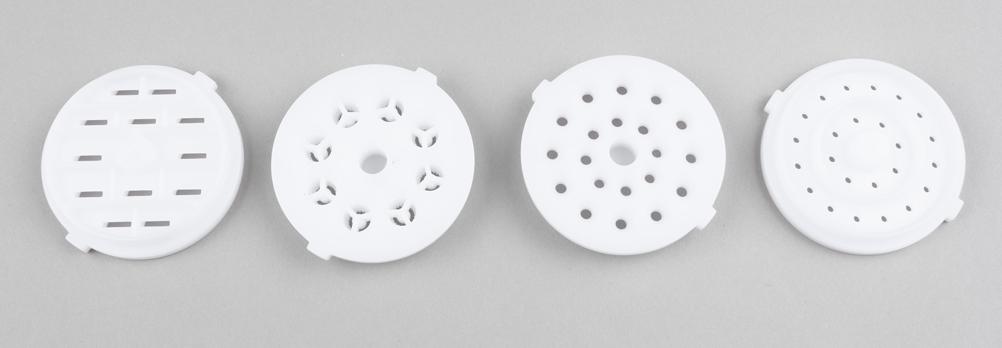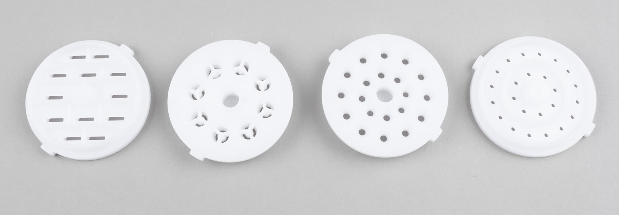 Белые пластиковые насадки для приготовления лапши позволяют, судя по конфигурации отверстий, готовить: