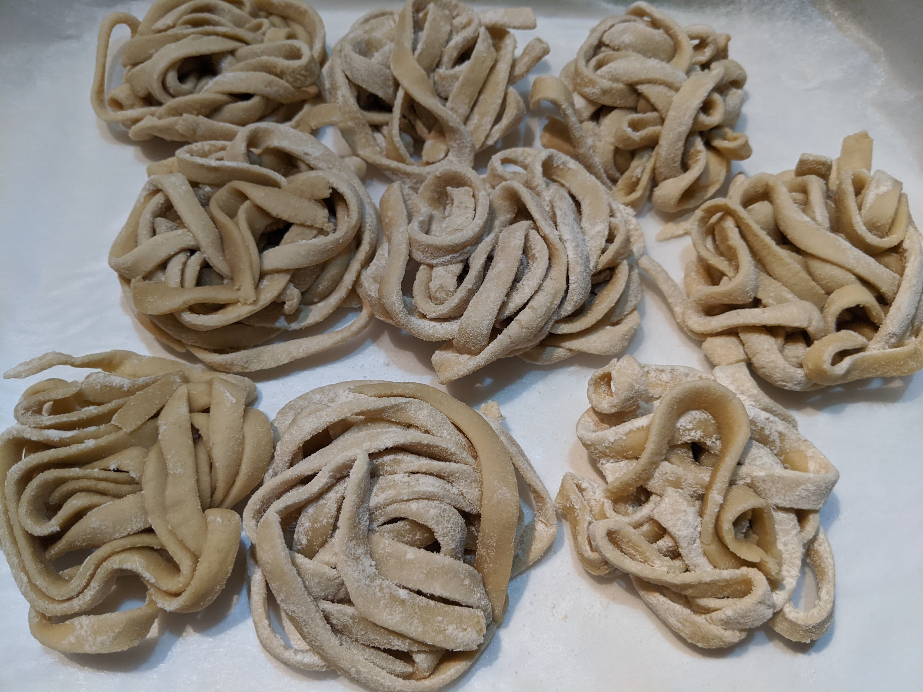 Прибор прекрасно справился и с формированием пасты из весьма крутого теста — менее чем за минуту все тесто было превращено в длинную пасту, причем наибольшее время у нас заняло не само приготовление макаронных изделий, а аккуратное раскладывание готового продукта на пергаменте для просушки.