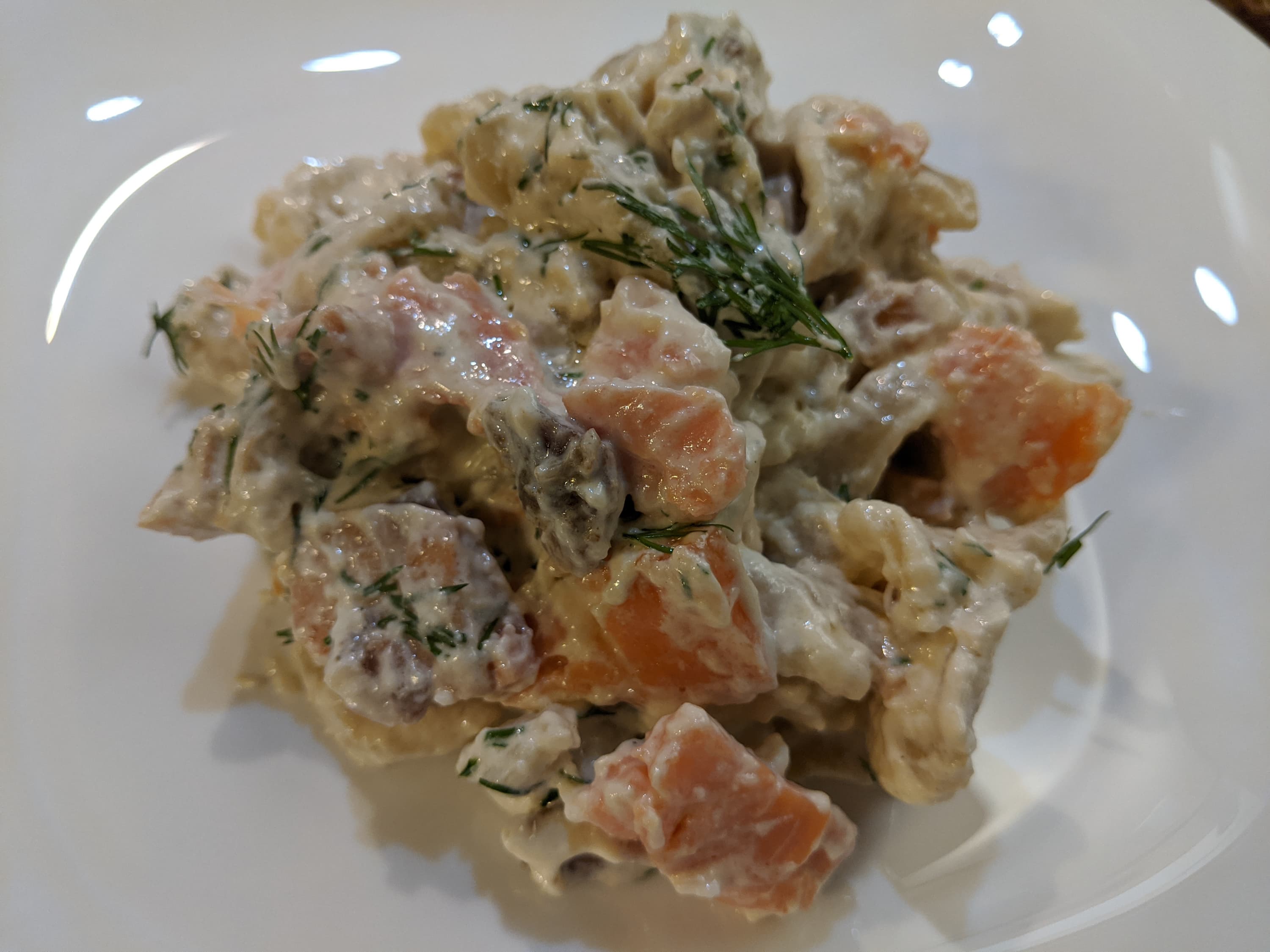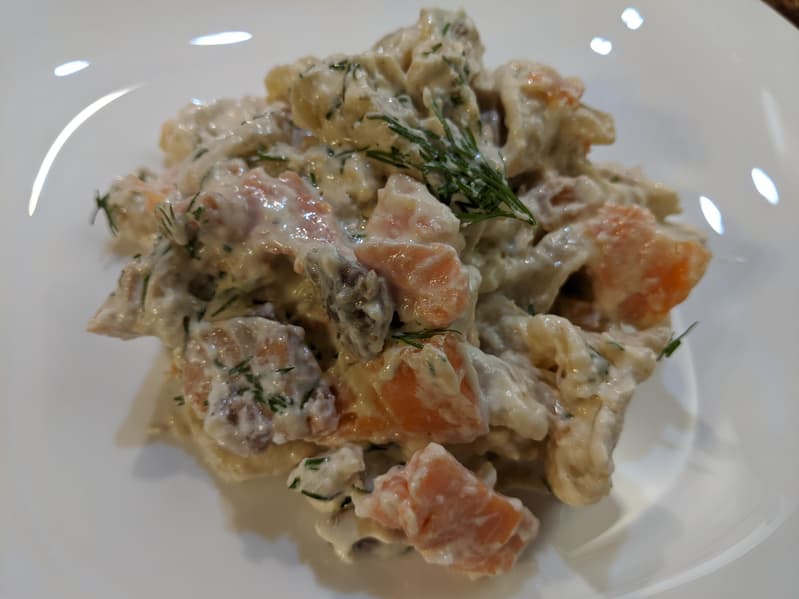 Готовые макаронные изделия мы просушили чуть меньше суток при комнатной температуре, сварили до полуготовности. Пока варилась паста, мы обжарили пару зубчиков чеснока на растительном масле, затем вынули чеснок, отдавший маслу аромат, спассеровали на этом же масле ломтики копчёной семги, выложили пасту на сковороду, залили десятипроцентными сливками и потомили под крышкой до готовности, добавив по вкусу черный перец и мелко рубленный укроп. Простое, неказистое с виду, но быстрое и вкусное блюдо.