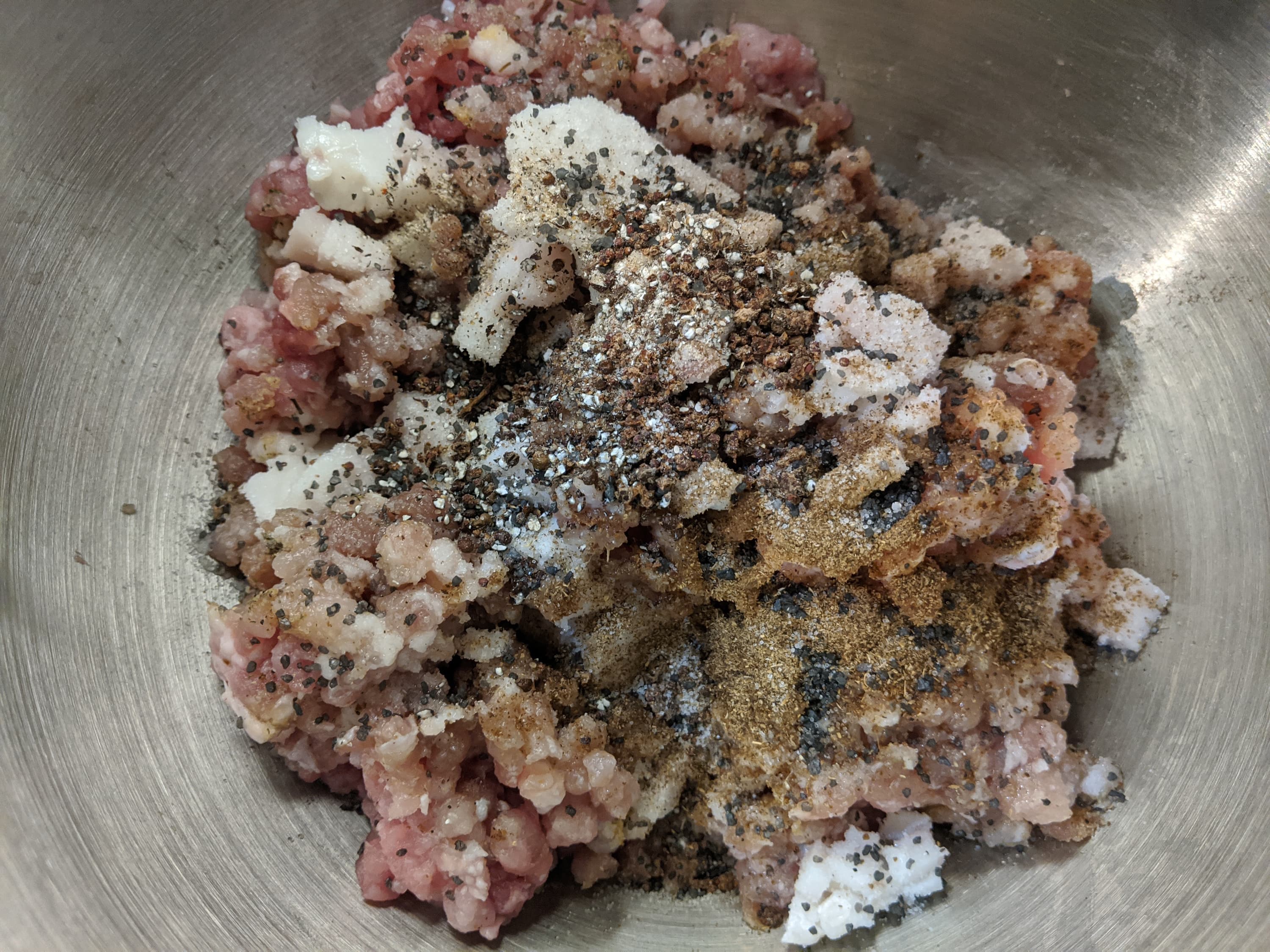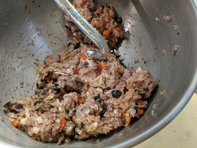 Полученный фарш мы смешали с нарубленными ножом остатками свинины, некрупно нарезанными кубиками сала, черными оливками и красным сладким перцем, добавили по вкусу соль и пряности и слегка вымесили в чаше миксера крюком для теста — чтобы фарш не оказался слишком однородным.