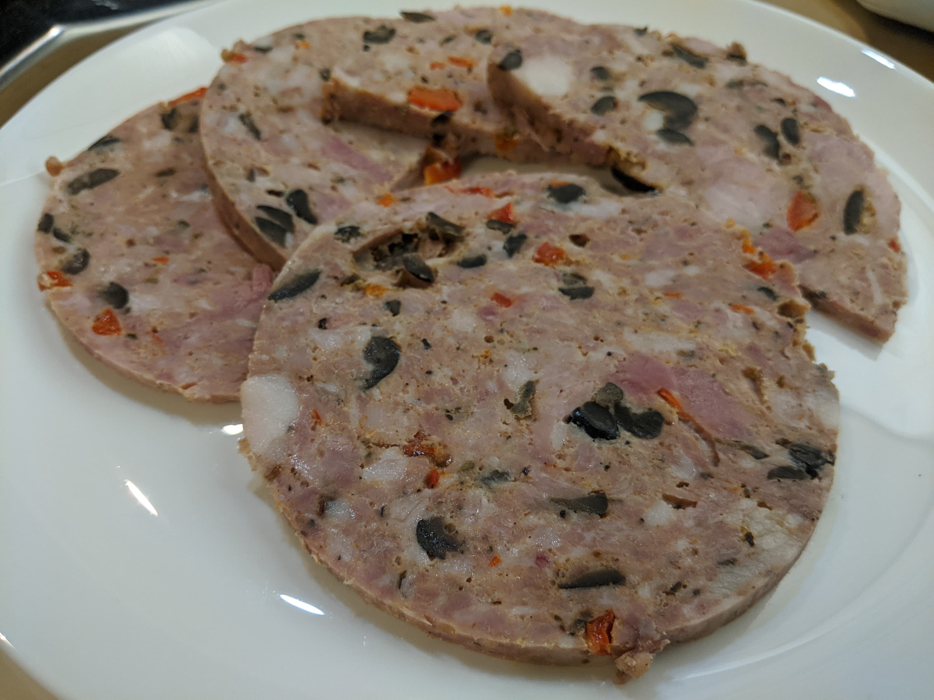 Готовую массу мы поместили в пищевой пакет, а его, в свою очередь, — в ветчинницу, которую выдержали два часа в мультиварке при температуре 70 °C. Результат — прекрасная пряная рубленая ветчина с приятной фактурой и недурным вкусом.