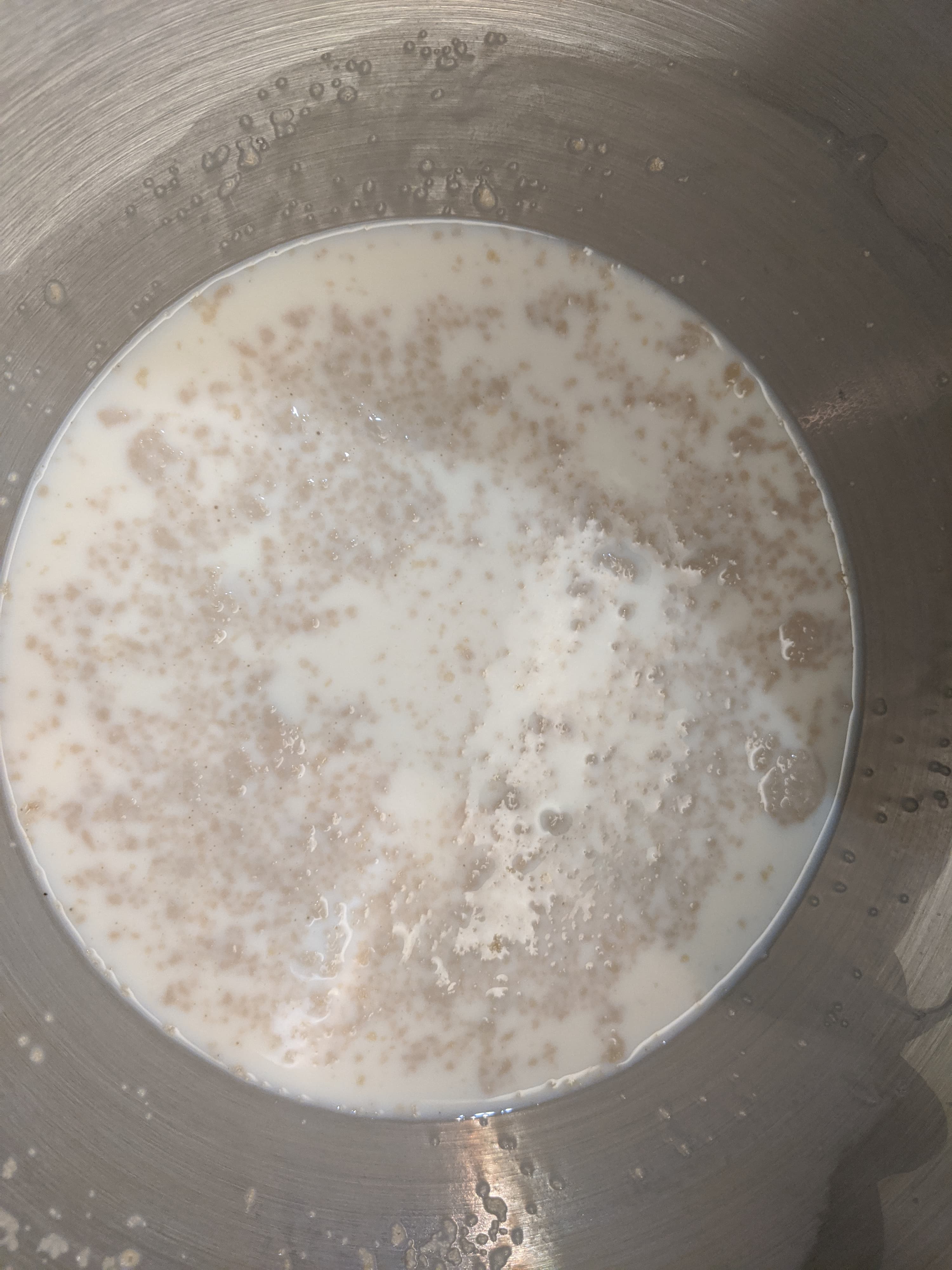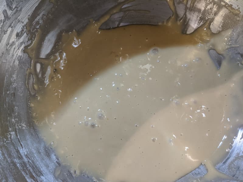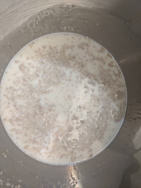 В чашу мы положили 3 столовые ложки сахара, залили их 200 миллилитрами сливок и 150 миллилитрами горячей воды. Полученную смесь размешали насадкой для смешивания в ленивом режиме — так, чтобы сахар разошелся, не более. Добавили 12 граммов сухих дрожжей и оставили дрожжи работать на 20 минут.
