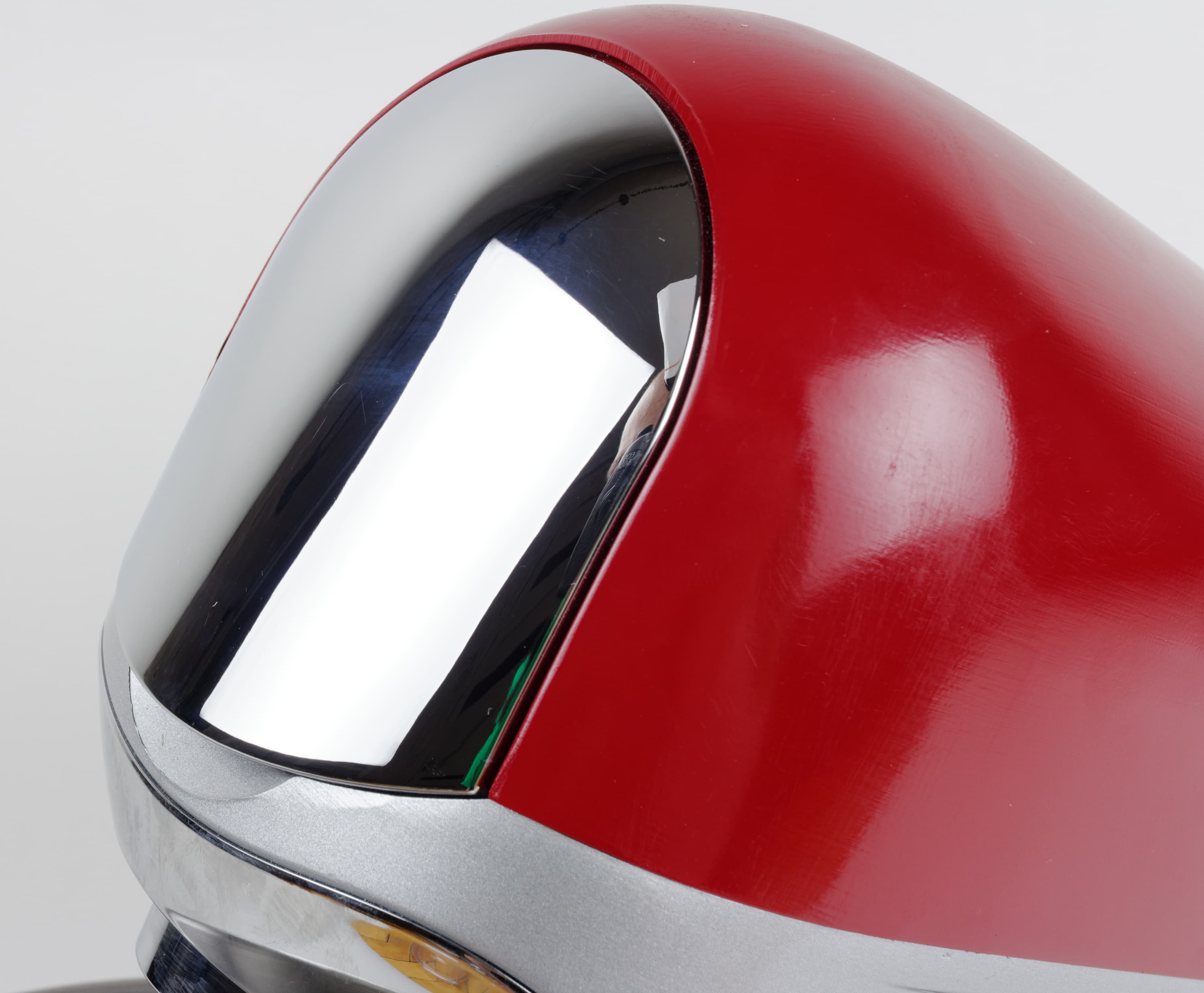 Верхняя часть подвижного блока покрыта красной металлизированной эмалью, что придает всему прибору нарядный вид. Она отделена от нижней полукруглой щелью. Между частями прибора расположен механизм, позволяющий поднимать или опускать этот блок, нажимая на черный пластиковый рычаг сзади. Если рычаг не нажат, блок надежно фиксируется как в поднятом, так и в опущенном положениях.