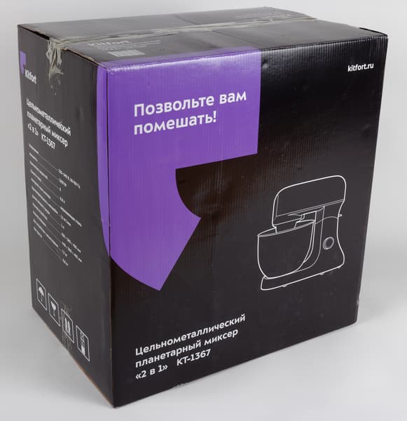 Цельнометаллический планетарный миксер KT-1367 приехал к нам в двух коробках: внешней транспортировочной из коричневого рыхлого картона и внутренней глянцевой, черной с фиолетовым. На внешней кроме названия прибора мы нашли только его модель, количество, вес нетто и брутто и размер коробки. Причем на одной стороне прибор был поименован по-русски, а на противоположной — по-немецки.