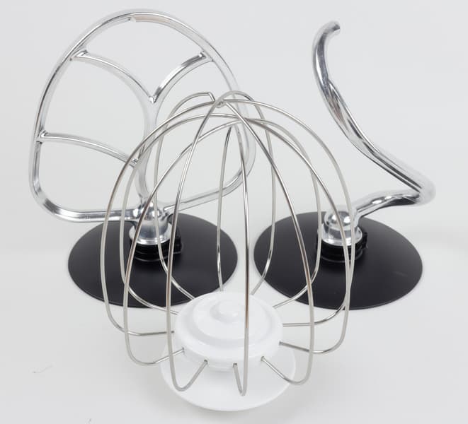 Традиционный комплект насадок практически не отличается от набора, свойственного для любого планетарного миксера. Венчик из упругих стальных стержней имеет форму капли. Силуминовый битер также стандартной формы с пластиковой крышкой сверху — она защищают место крепления насадки от брызг. Такая же крышка есть и у силуминового крюка. По форме он напоминает слегка разогнутый фрагмент спирали ДНК с небольшим утолщением в форме плавника.