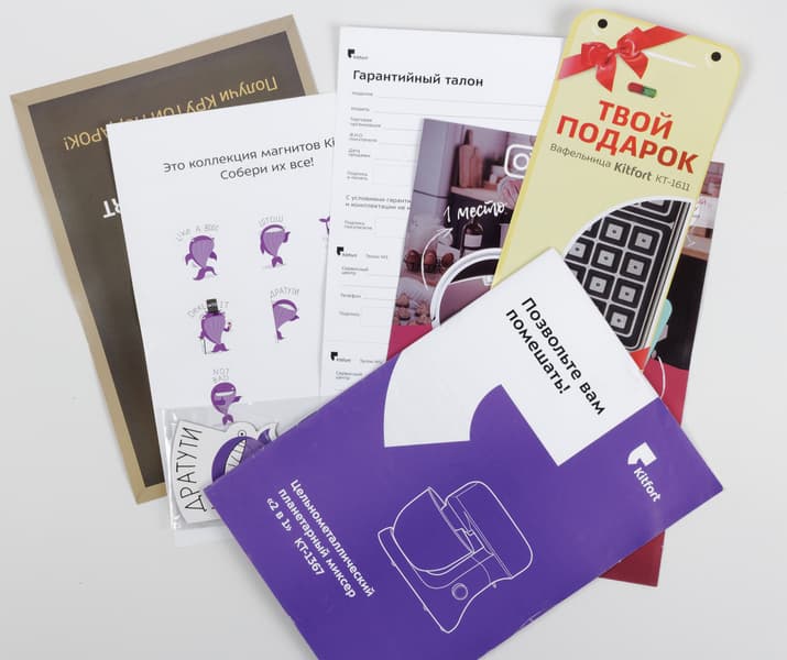 Как обычно у компании Kitfort, руководство пользователя составлено по шаблону. На обложке слоган и название модели плюс ее схематическое изображение. На заметку: из картинок на коробке и обложке вы ни за что не поймете, что это не просто планетарный миксер. Хорошо для подарка, если у вас попросили планетарный миксер, — и подарок, и сюрприз в одной коробке.