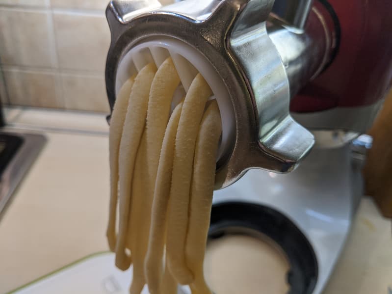 Макаронные изделия мы решили готовить по рецепту из инструкции. Сначала крюком замесили в планетарном миксере 225 граммов муки, яйцо, 15 мл растительного масла и 45 мл воды. Это достаточно крутое тесто, чтобы его можно было засчитать за обязательный тест по вымешиванию трудных субстанций, — и миксер с ним прекрасно справился.