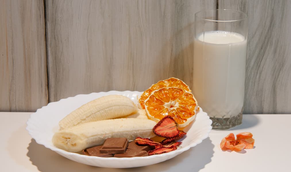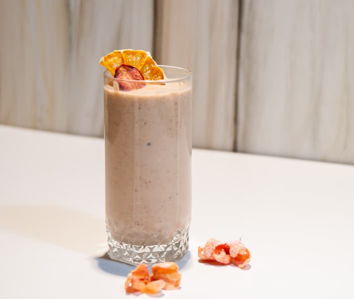 Мы модифицировали рецепт обычного бананово-шоколадного молочного коктейля, добавив в него сушеную клубнику и сушеный апельсин.