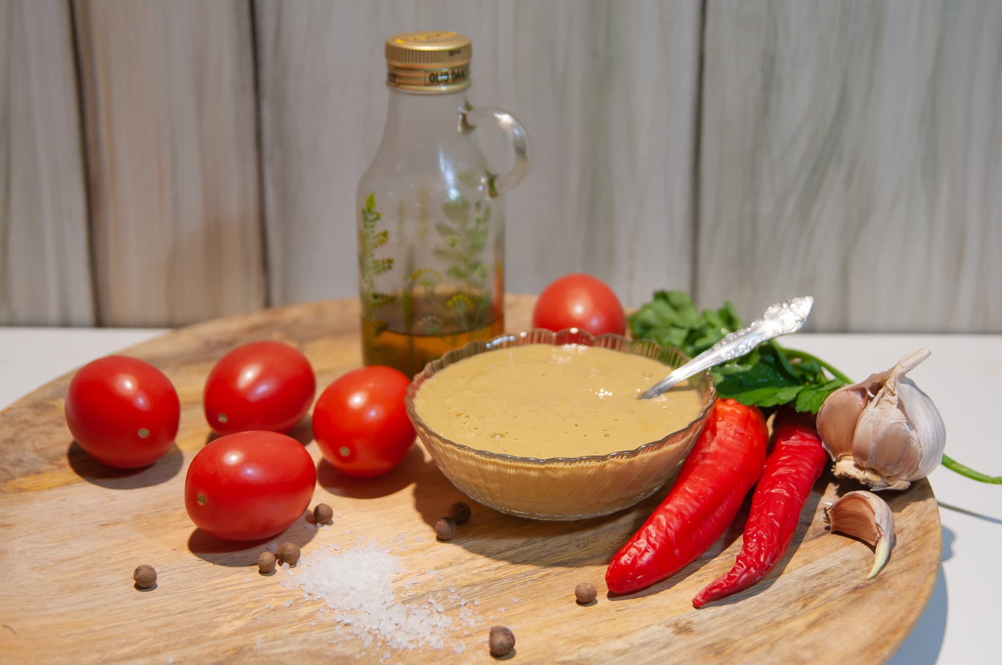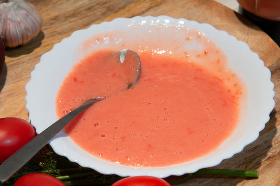 Мы добавили к томатной массе оливковое масло, чеснок, острый перец, соль и зелень и еще через минуту получили отличную однородную заправку для салатов с ярким свежим вкусом.