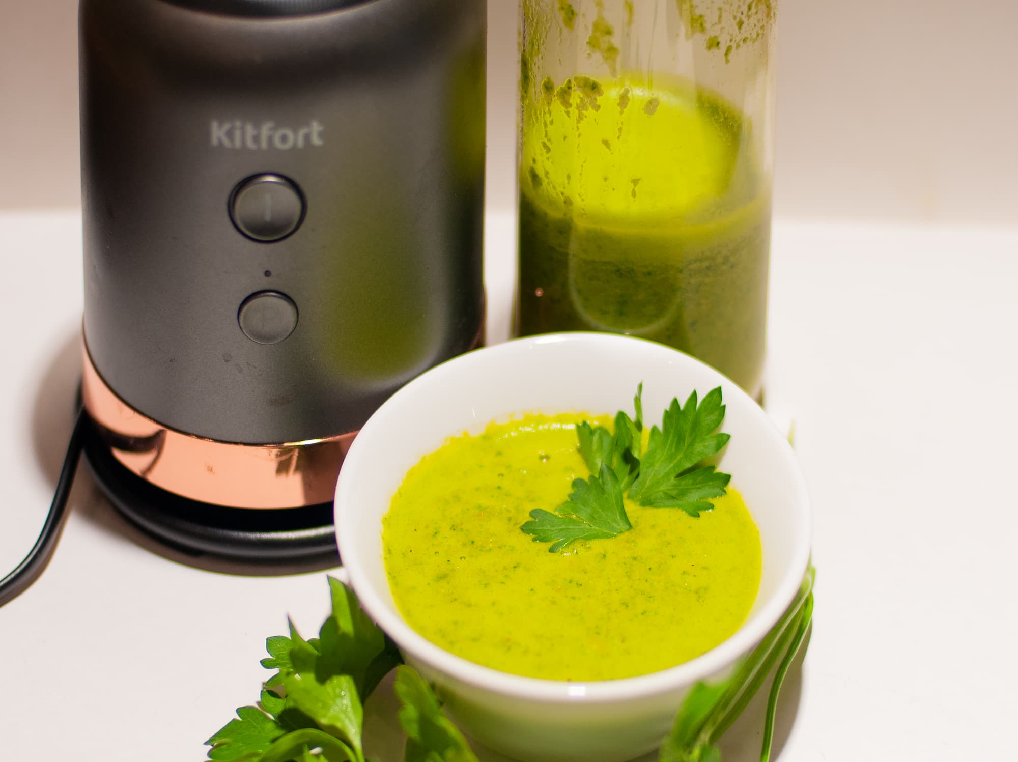 Данный тест был проверкой: может ли пластиковый стакан выдержать горячий суп, не деформироваться и не потечь? Мы налили в прилагаемый к прибору стакан куриный суп с кусочками курицы и крупной морковкой при температуре около 50 °C, положили в него небольшой пучок петрушки и прокрутили в блендере. За 40 секунд суп стал однородным, зелень, мясо и морковь хорошо измельчились. Стакан хорошо выдержал температурную нагрузку, соединение не потекло, деформации и прочих сюрпризов не случилось, посторонний запах тоже отсутствовал.