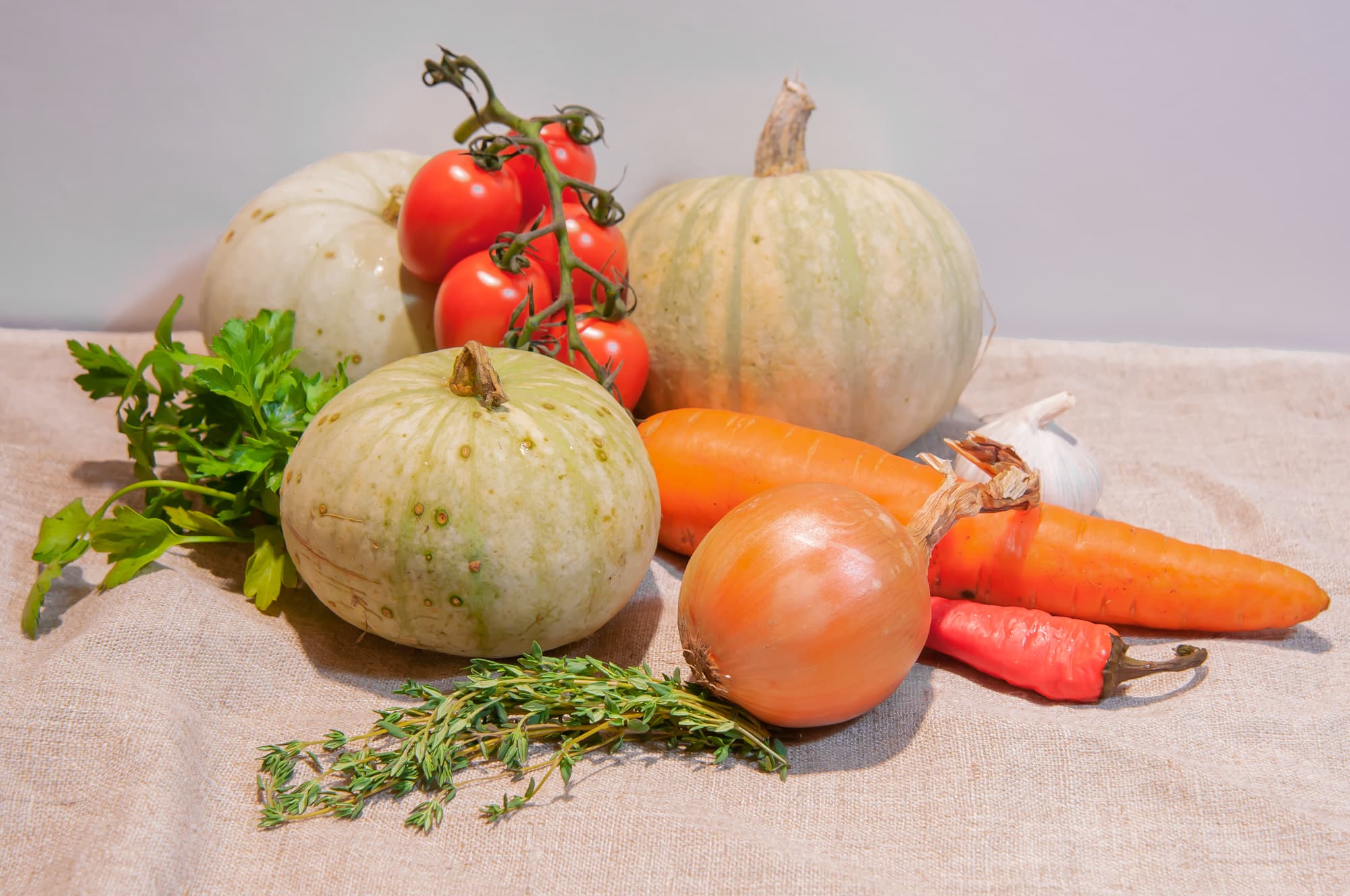 Мы взяли тыкву, морковь, лук, чеснок, томаты, зелень, острый перец и соль.
