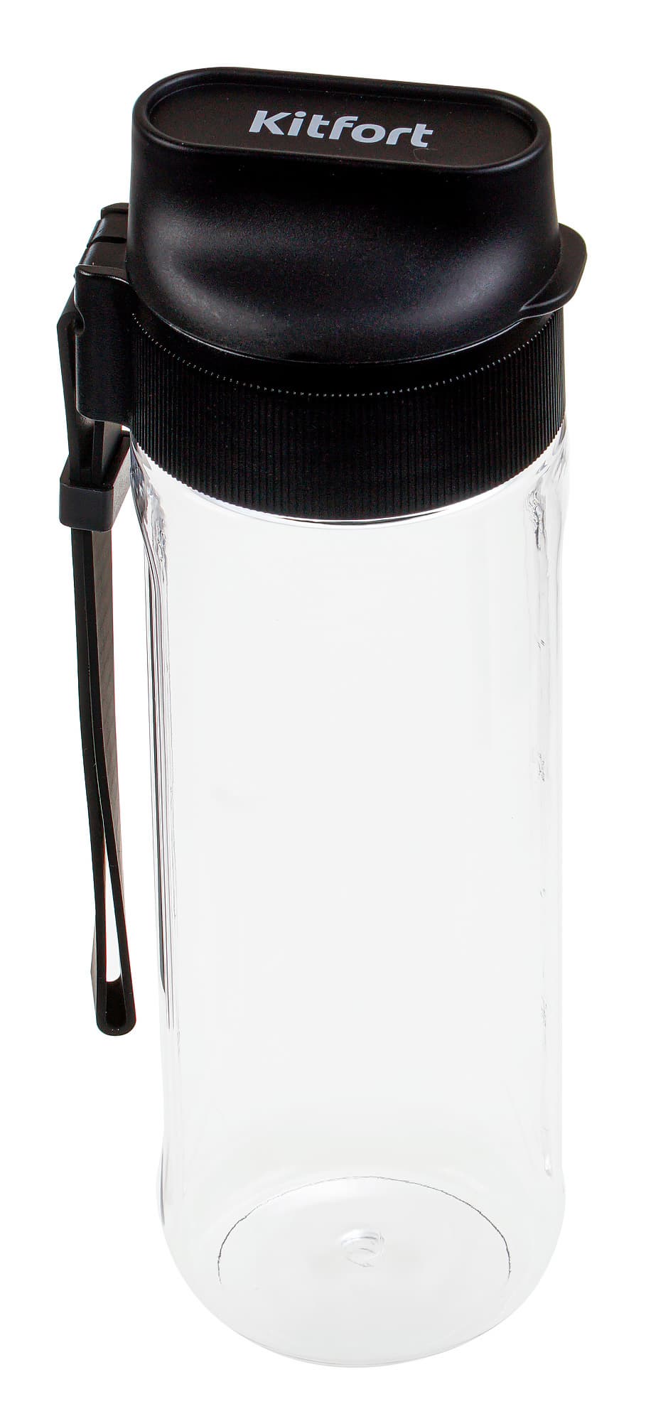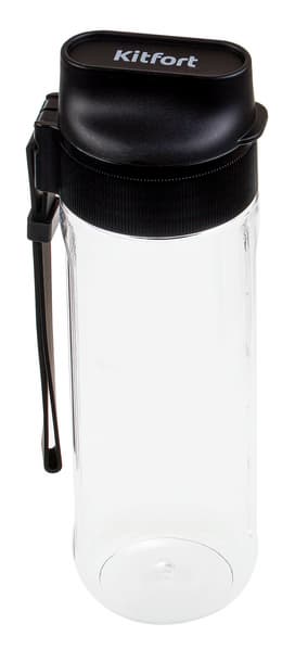 Дополнительный пластиковый стакан емкостью 600 мл плотно закрывается удобной крышкой с резьбой и силиконовым уплотнением. На крышке стакана есть лямка для фиксации его на поясе, а также специальное отверстие-непроливайка для питья. На крышке стакана, как и на моторном блоке блендера, белым цветом напечатан бренд производителя.