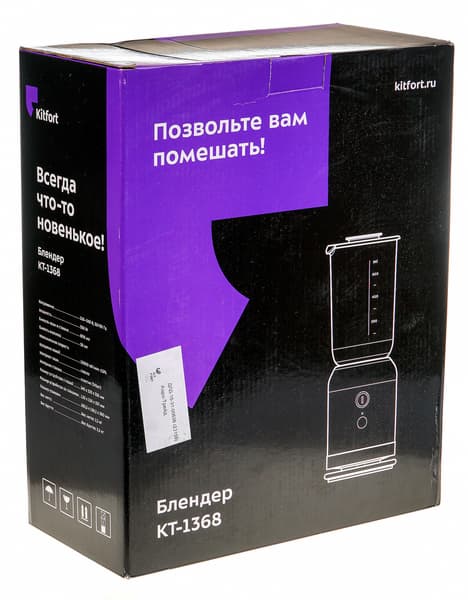 Блендер прибыл на тестирование в картонной коробке, оформленной в новой черно-фиолетовой гамме. На коробке присутствуют: схематичное изображение прибора, а также основные характеристики и техническая информация. В качестве защиты от ударов в процессе транспортировки внутри коробки блендер упакован в картонные ячейки. Коробка выглядит надежной, но ручками для переноски она не оснащена.