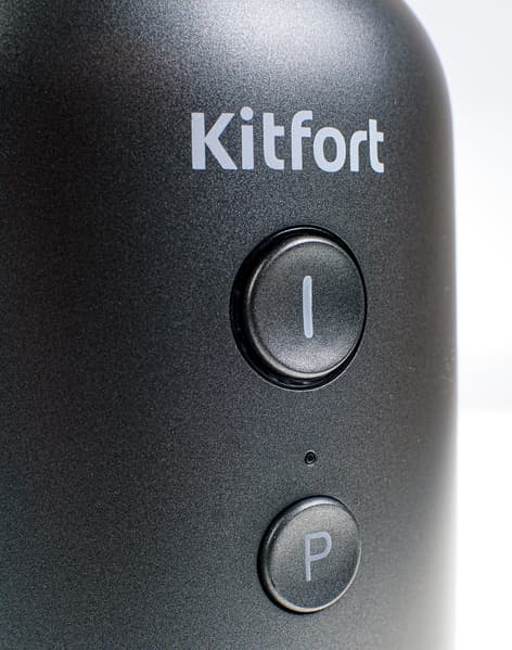 Всё управление блендером КТ-1368 осуществляется с помощью двух кнопок на передней стороне моторного блока. Верхняя большая кнопка включения при сильном нажатии может фиксироваться в нажатом положении. Нижняя отвечает за импульсный режим и фиксироваться не может. Кнопки удобные, нажимаются легко, управление интуитивно понятно.