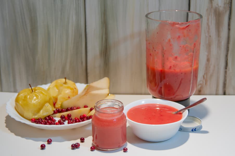Разобравшись с размером порции, мы решили опробовать стандартный рецепт детской смеси — грушу без шкурки и печеное яблоко, но добавили в него еще бруснику и натуральный яблочный мармелад для вкуса.