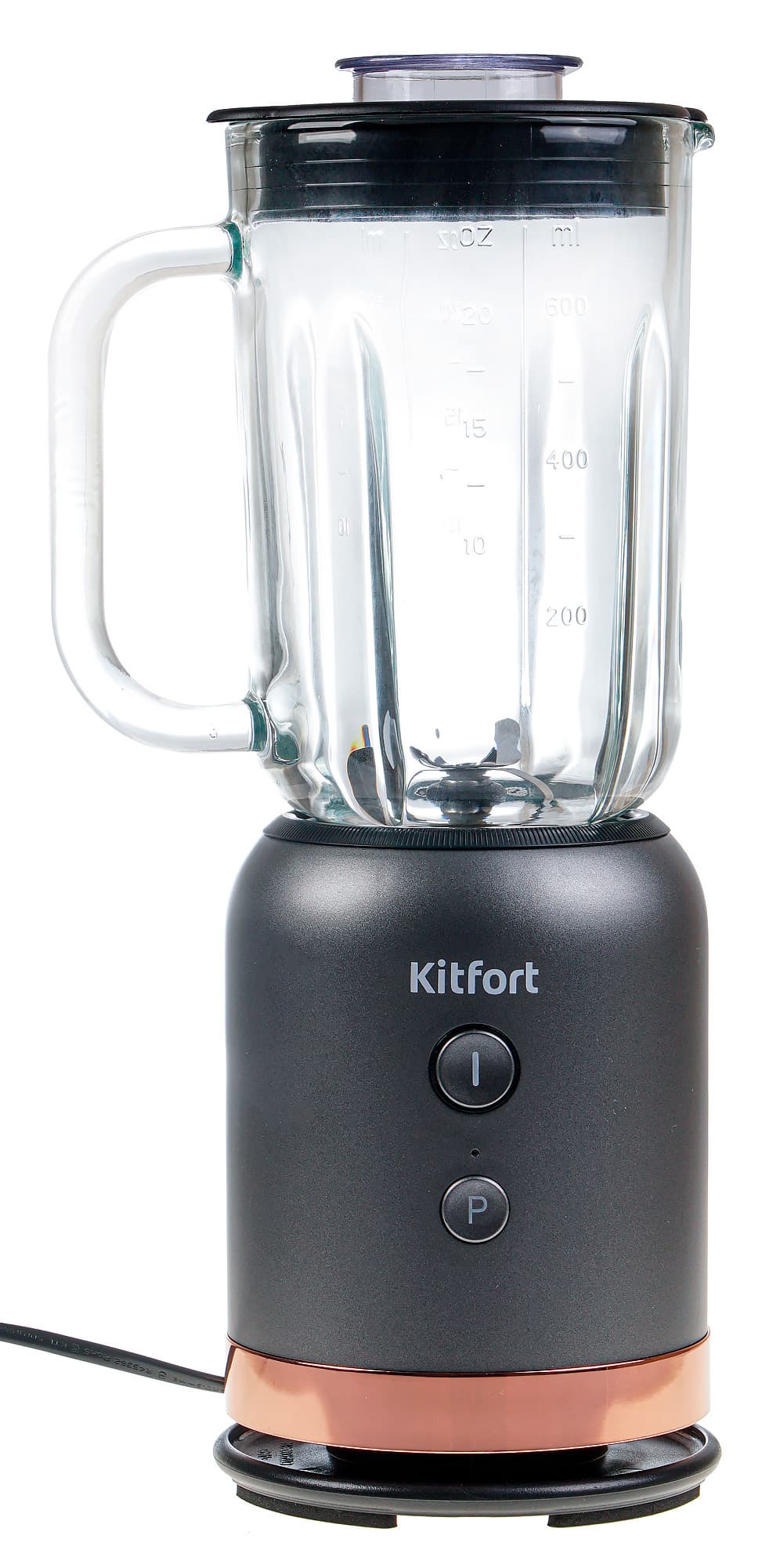 Блендер КТ-1368 совсем небольшой, но благодаря дизайну выглядит аккуратно и стильно. Моторный блок выполнен в графитовом цвете, компактный стеклянный кувшин сверху закрыт черной крышкой с прозрачным мерным колпачком. Снизу, под нарядной вставкой медного цвета располагается отсек для сматывания шнура.